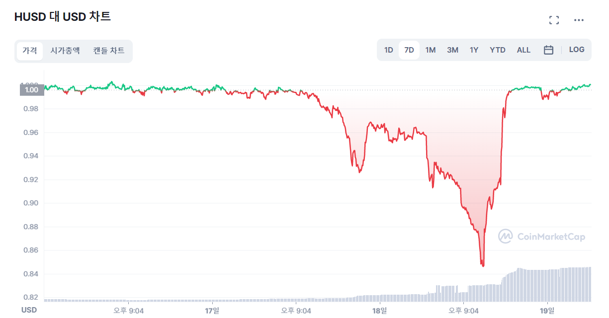 8월 18일 후오비 글로벌이 발행한 스테이블 코인 HUSD가 디페깅(depegging)되어 0.85달러까지 폭락했어요.