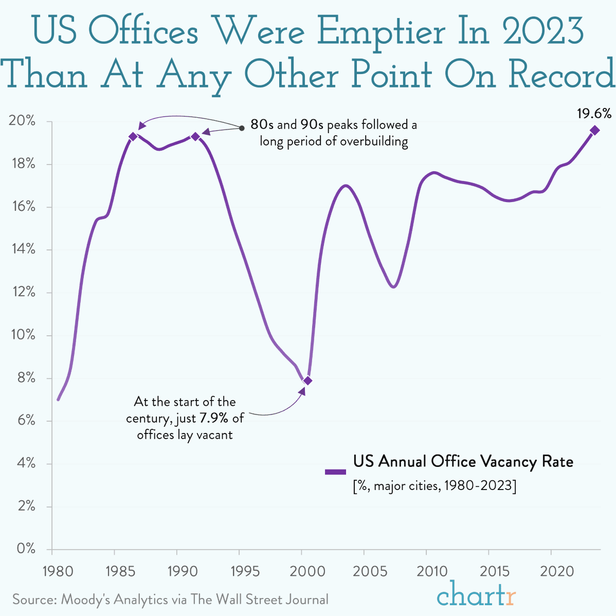 미국 사무실의 공실률은 1980년 이후 최악으로 치닫고 있다. 코로나 쇼크로 인한 재택근무 트렌드 + 경제둔화가 겹쳐진 결과다.