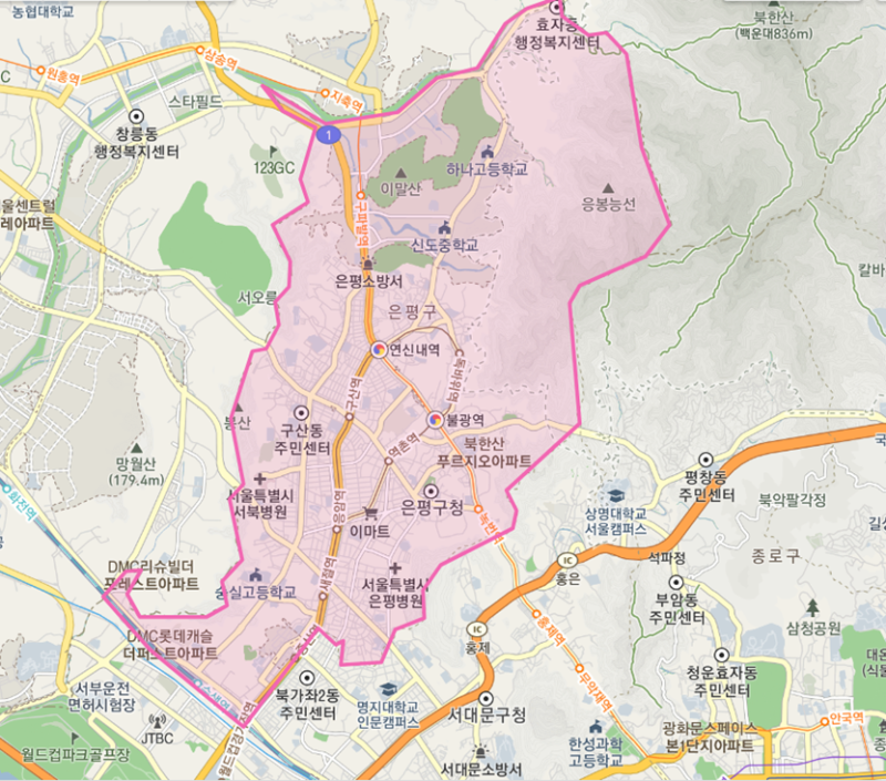 지리적 위치: 서울시의 북서부에 위치한 자치구. 1979년에 서대문구에서 분구 되었다. 북쪽과 서쪽으로는 경기도 고양시, 동남쪽으로는 종로구, 남쪽으로는 서대문구, 마포구와 접해 있다