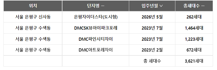 1. 수색동: DMC SK뷰 (2021년입주) / 15.4 억 / 15억 / 14억 / 7.5억 /6.5억